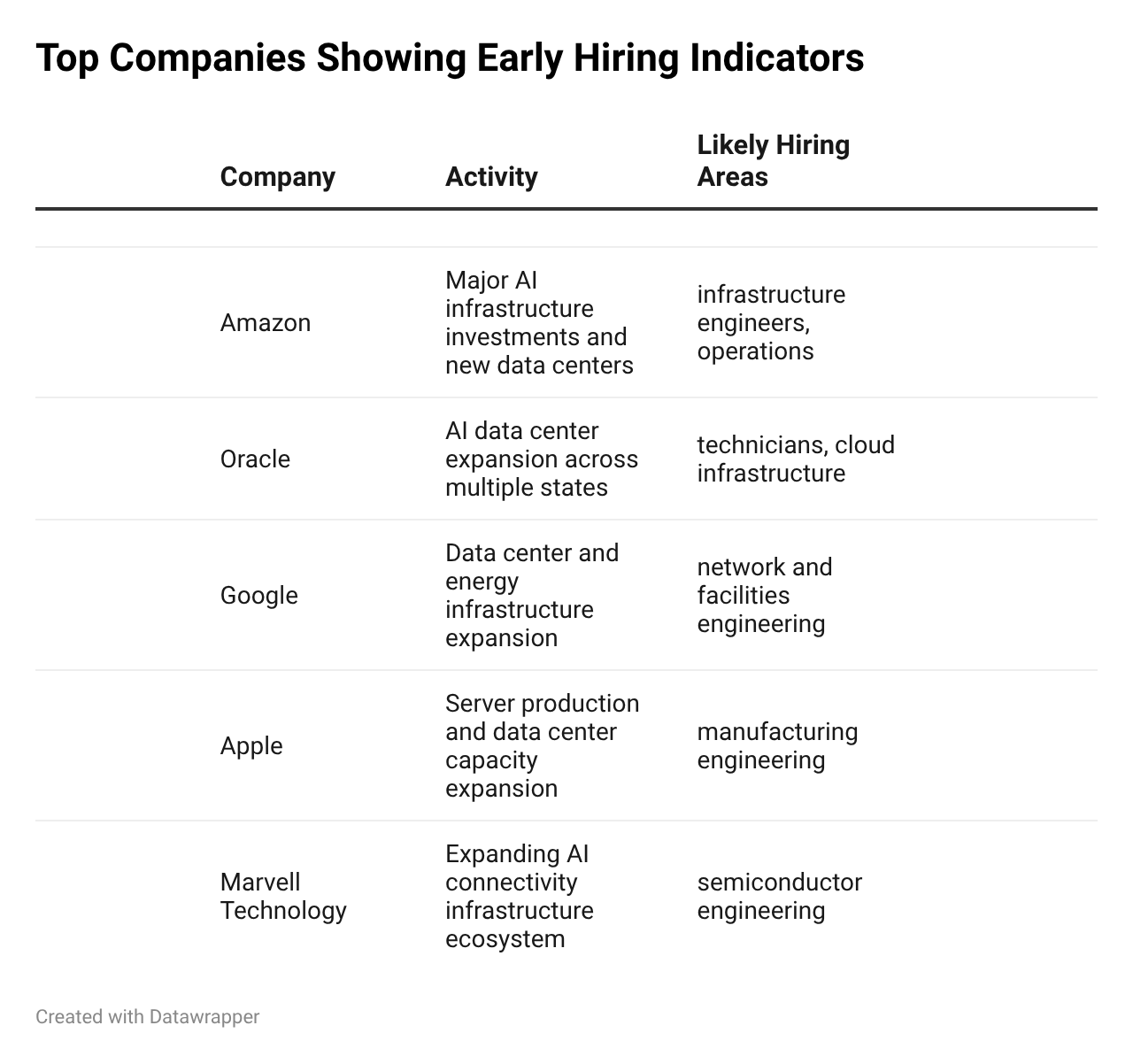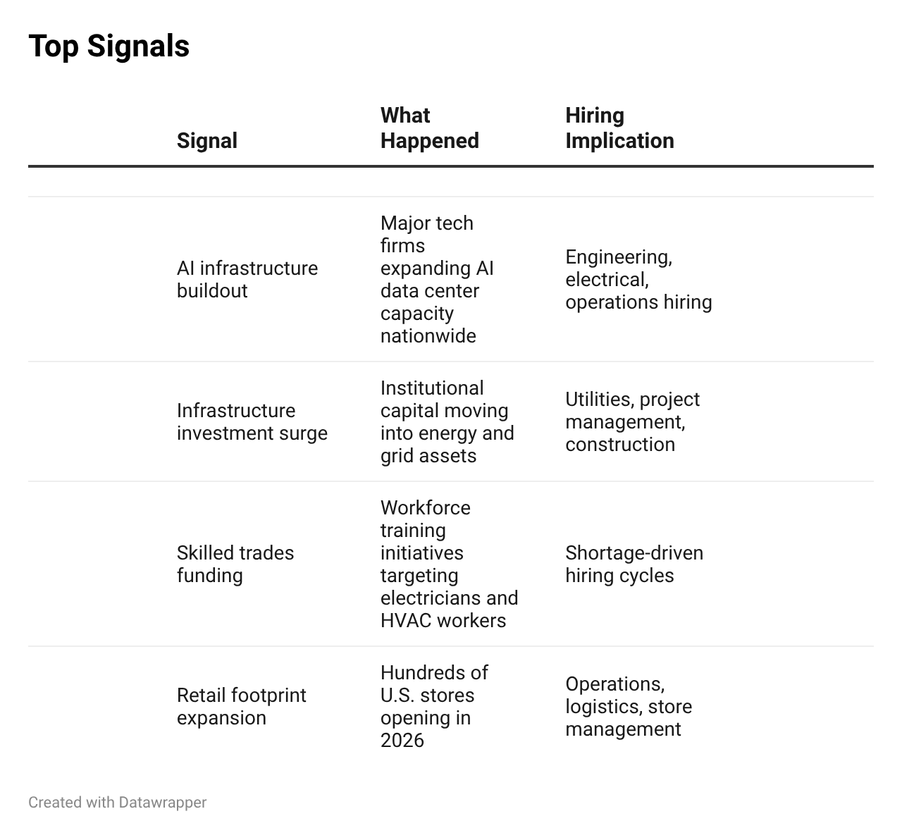 Capital spending is moving into physical systems that support AI, which historically triggers hiring cycles that appear 6–18 months before mainstream job postings.